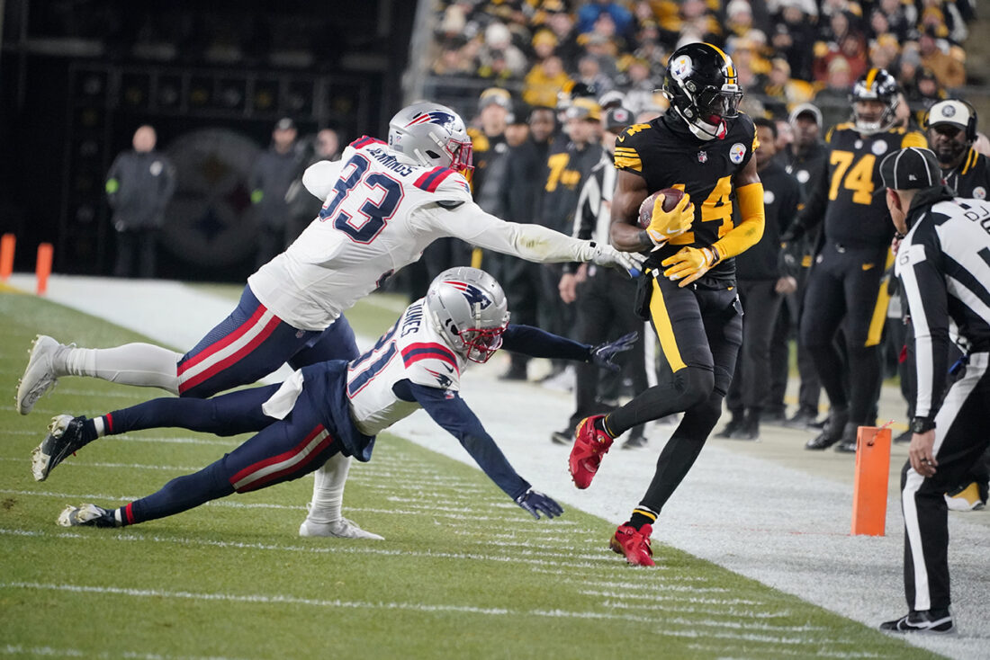 Pittsburgh Steelers wide receiver George Pickens (14 years old) was forced out of bounds by New England Patriots linebacker Anfernee Jennings (33 years old) and cornerback Jonathan Jones (31 years old) after catching a pass during the second half of a football game. Football in the NFL on Thursday, December 7th. 2023 in Pittsburgh. (AP Photo/Jane J. Pushkar)
