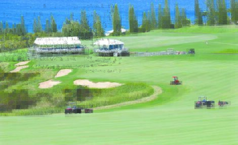 Kapalua Agriculture Course workers prepare the 18th fairway on Tuesday. Maui News/Photo by Matthew Thayer