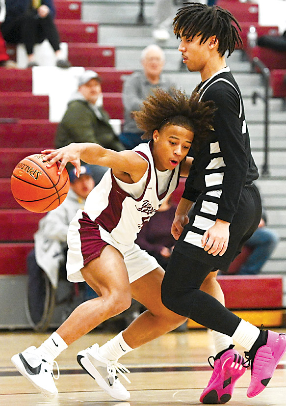 Mirror photo taken by Nymire Shields’ Patrick Wakmonski of Altoona trying to dribble around Central Dauphin East’s AJ Cooper at AAHS Fieldhouse on Friday night.